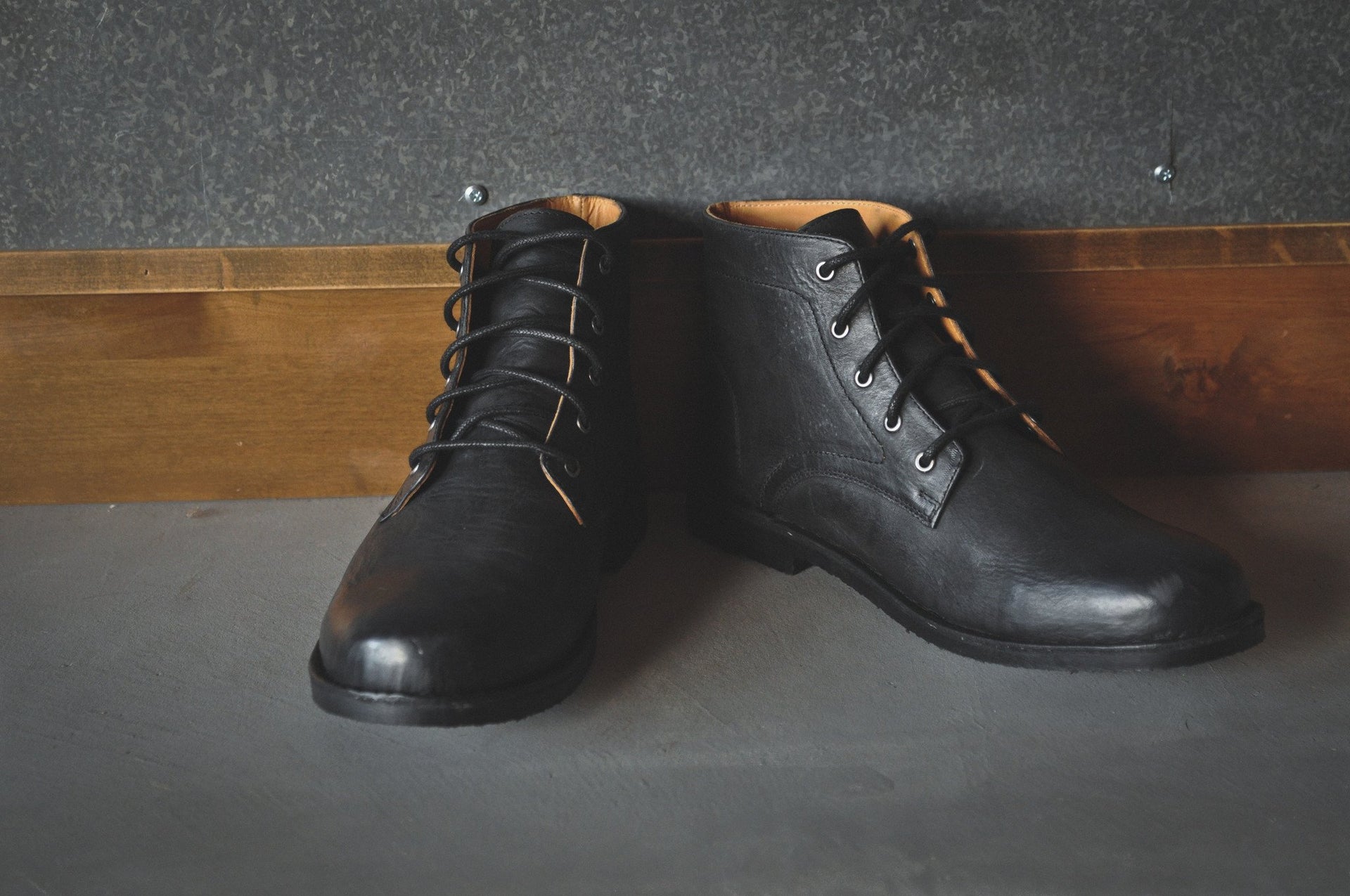 The original “desert boot” was created as a comfortable casual shoe able to survive harsh desert conditions. We think our version works just as well walking downtown streets or propped up on the railing at your favorite watering hole. We made ours just a tad taller than the classic, with 5 eyelets in place of 2 or 3 giving a fresh twist to an old standard. This style features a hand-crafted “stitch-out” construction, that we pair with a TPR (Thermo-Plastic- Rubber) unit outsole- acclaimed for its slip-resistance, flexibility and durability. As a nod to the original we have given the outsole a crepe texture. Besides classic suede (which we also hand-burnish along the edges, toe and heel) we also offer two versions in buffalo leather: black and a daring “oxblood”. The Grover is built on the Rambler last, featuring a strong high-walled toe character that is at once bold and comfortable.