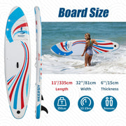Length: 11' Width: 32" Thickness: 6" Item Weight: 19.4 Lbs Max Capacity: 350 Lbs Max PSI: 15 PSI/1Bar Material: Military Grade Durable drop-stitch fabric +PVC+EVA