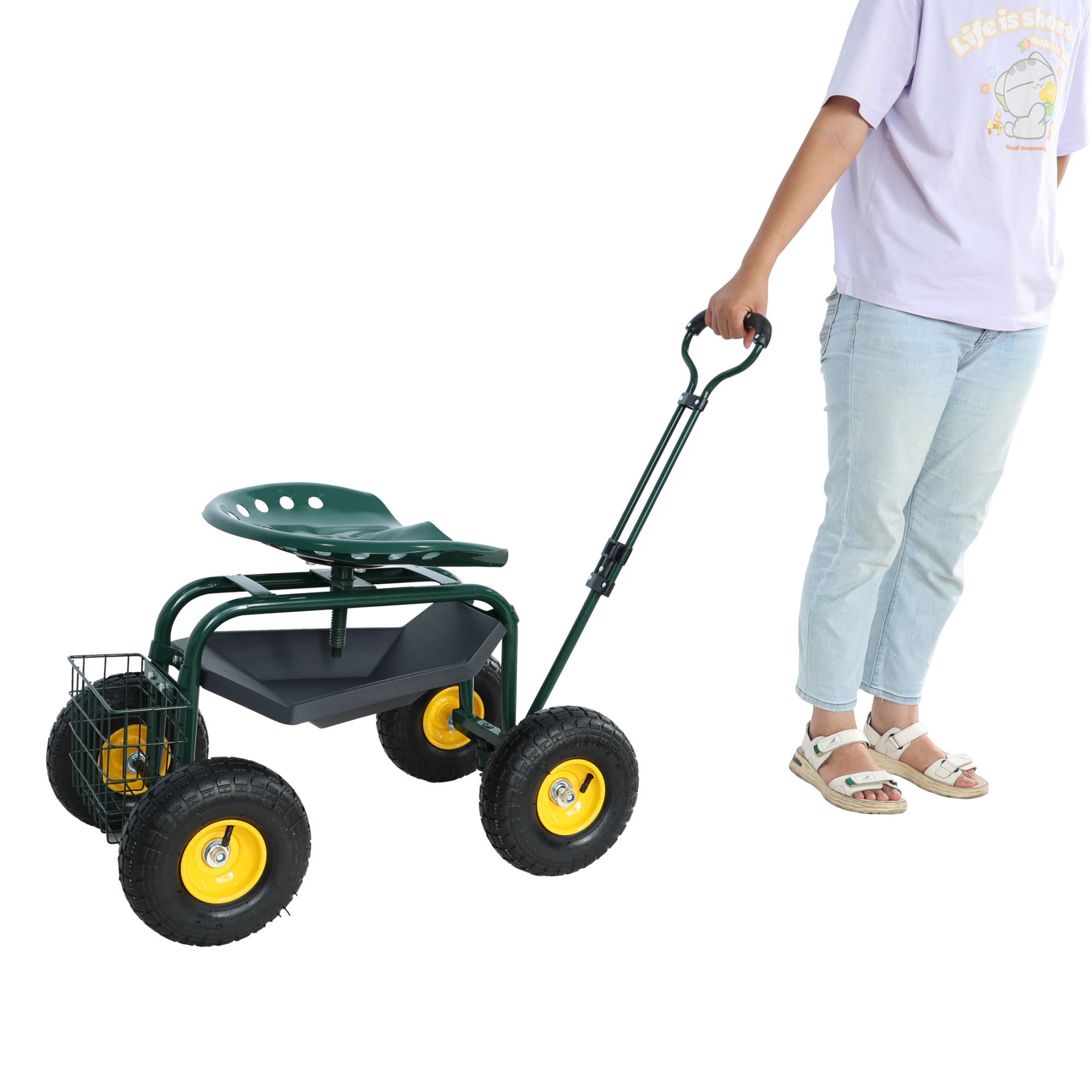 Garden trolley Rolling work chair with wheels, garden stool for planting, 360 degree swivel seat, station wagon scooter with steering handle and utility tray, for yard and outdoors, (green)