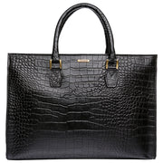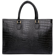 A classic and elegant women's work bag. This bag is sure to stand out and pairs beautifully with office attire. The bag is not bulky, yet can fit necessary papers and a tablet or iPad. "Leather: Rich full grain croco pattern embossed leather.. Lining: Red cotton for brown bag and black polyester for black bag Closure: magnetic snap button. Handles & Strap: Detachable leather shoulder strap and two leather top handles. Interior Details: One main compartment, one center zip compartment, several small interior pockets for mobile phones and accessories, one dog lock hook to fasten keys. Measurements: 14.57""L x 10.24""H x 3.74""W"