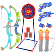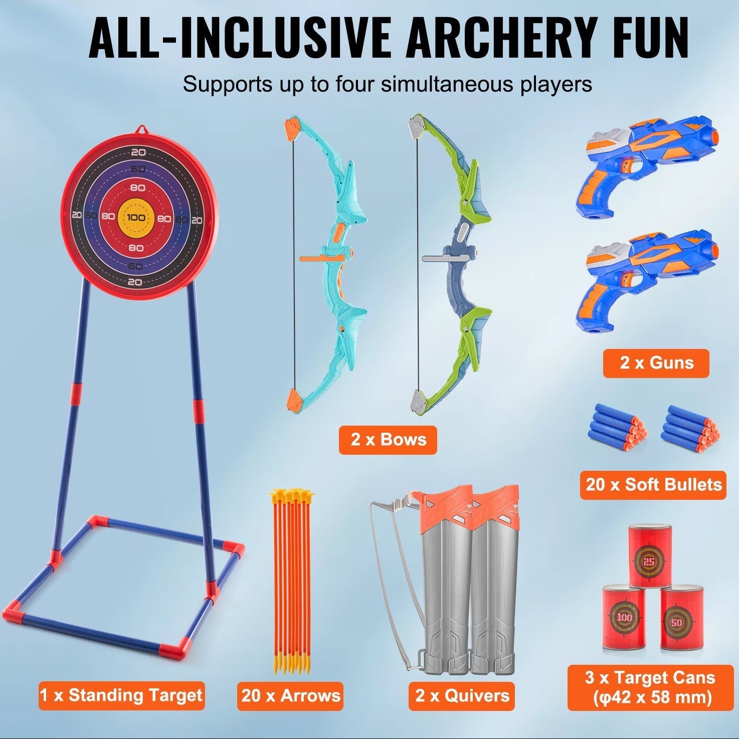 Comprehensive Entertainment Solution: Made with top-quality, durable materials, our kids bow and arrow set is built to last through all your outdoor adventures. Inside, you'll find 2 bows with cool lights, 20 arrows, 2 quivers, 2 guns, 20 soft bullets, 1 standing target, and 3 target cans. It's all about endless laughs and good times, perfect for every family outing! (Batteries not included.)