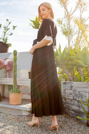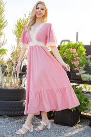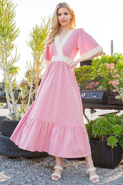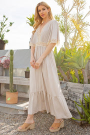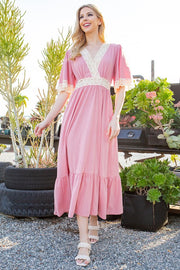 Front wrapped tier dress with lace trimmed detailed in heavy rayon spandex with flutter sleeves.