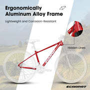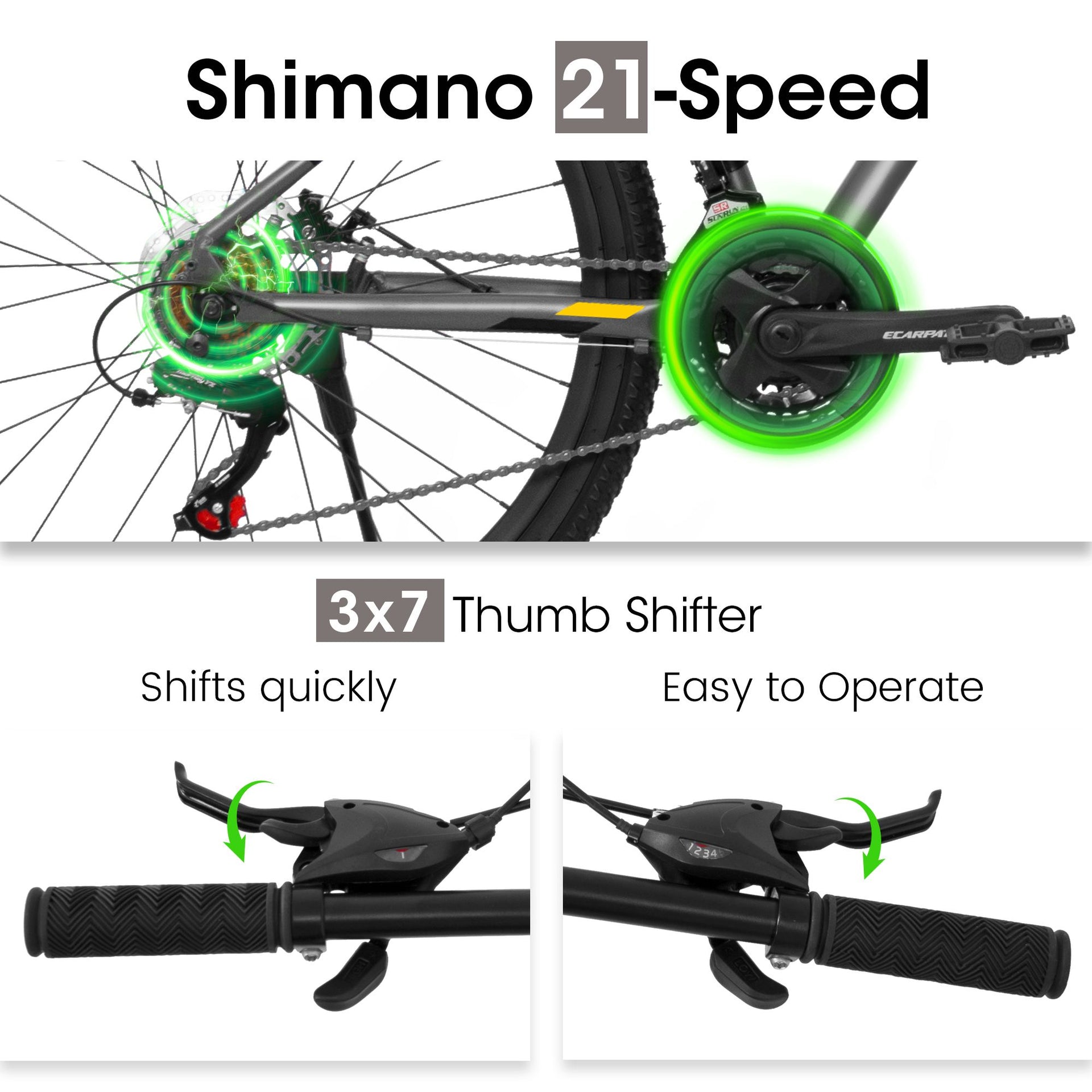 [Durable Aluminium Frame]27x16 inch sturdy and durable aluminium frame, provide safe and stable cycling experience. Ergonomically design, suitable for mens womens height 4'2"-4'9", max weight is up to 250lbs.[21-Speed with Disc Brakes]Thumb shifter help to switch gears with smoothness. Simple operation allows for quick selection of gears for various terrains. Mechanical dual disc brake system, simple structure and convenient for maintenance.[Front Fork Shock Absorbing Design]Feature 100mm front suspension fork. The thickened fork help resistant and absorb shocks. The parallel bars can adapt to pressure road conditions. Greatly improve the comfort during riding and allows you to enjoy riding.[27*2.125" All-Terrain Tires]Made of high quality rubber, all-terrain tires with strong puncture ressistance soften the bumps and stick to the Dirt, Trail, Gravel, Paved Path for a smooth, stable ride: strong grip, have a super excellent anti-skid function and is not easy to slip.[85% Pre-Assembled]The bike comes 85% pre-assembled. You need to assemble the handlebar, saddle, front wheel and pedals. After a short adjustment of the brakes and gears you can start riding immediately. Please note that if you have any questions, you could contact our customer service first.