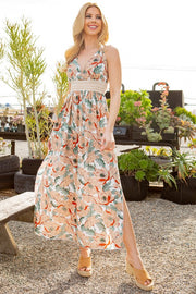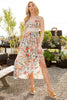 Stretch elastic clunny lace trimmed floral dress with side slits.